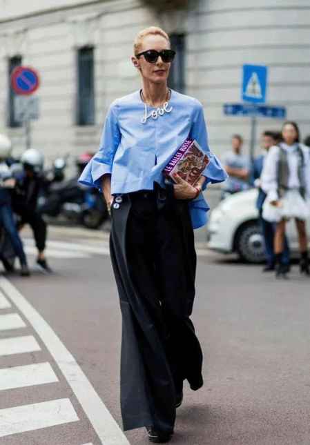 比如选择短款蓝衬衫搭配长款阔腿裤超显腿长,随心优雅,可以穿至任何场合。