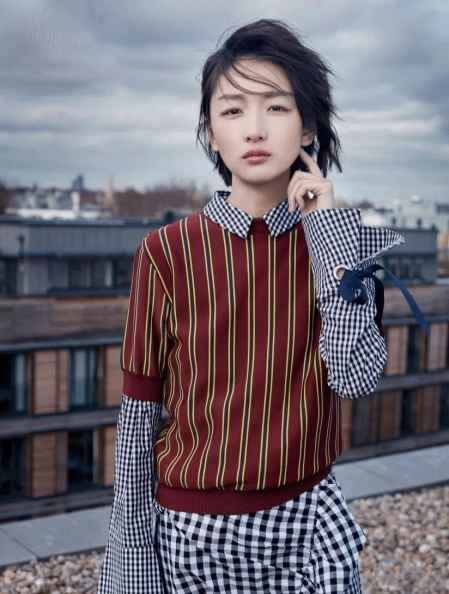 这种搭法十分减龄,把衬衫的衣领露出来,复古英伦。像周冬雨选择半袖毛衣,更添书卷气质。