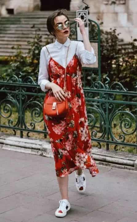 吊带印花裙加上一双简单又不失休闲感的运动鞋造型,造型层次感十足,夏季穿轻松赚足回头率。