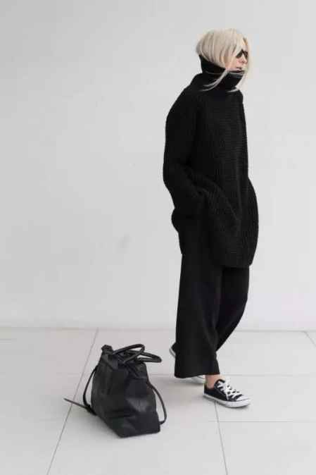 搭配阔腿裤的话,则需要穿出垂坠与宽松感,才会很显瘦哦。如果要穿九分裤的话,为了不那么冷,记得用一双黑色长袜来让脚踝显瘦。