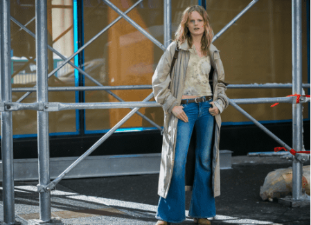 运动气息十足的配搭因阔退牛仔裤的加入而显得精致,喇叭裤的形态搭配长款大衣飘逸而又有着十足的遮肉效果。