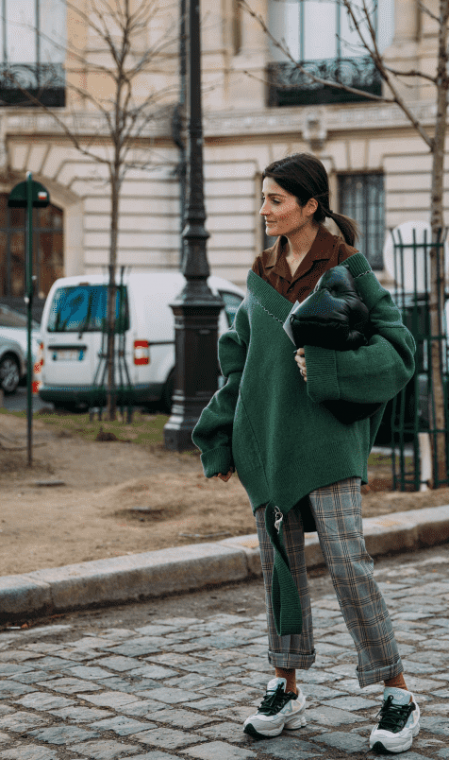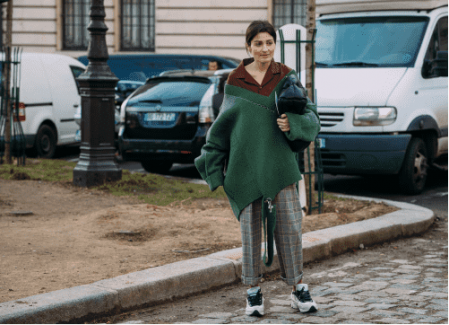 宽松的配搭可以有效遮住全身粗壮的部位,针织衫更添柔软质感,九分裤可以露出纤细的脚踝,在视觉上立显窈窕。