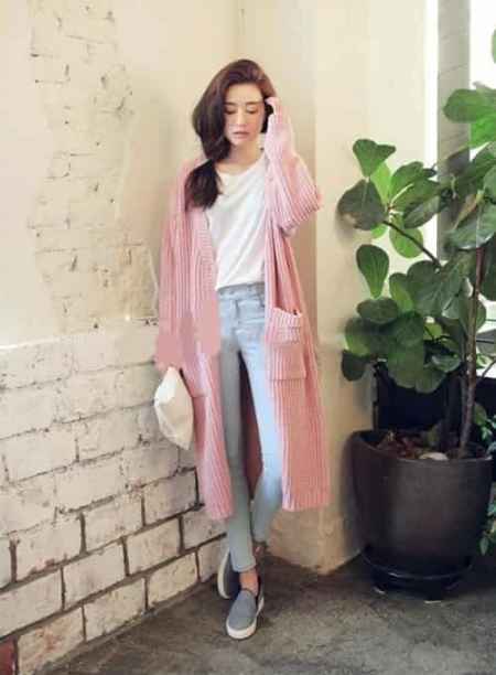 LOOK1:长款粉色针织衫+白T+牛仔裤