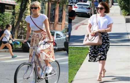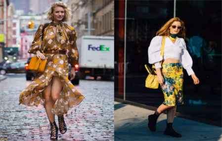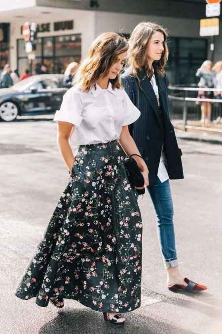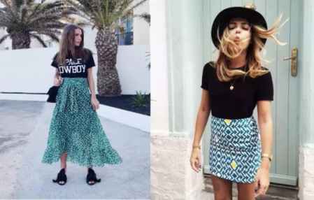 比如讲说我们在度假期,下面两位时尚大佬就都是采用了碎花裙作为整体搭配。但我们很明显的就能感觉到,穿白色T恤配碎花半身裙就明显要比整体都是碎花要简洁清爽大方很多~