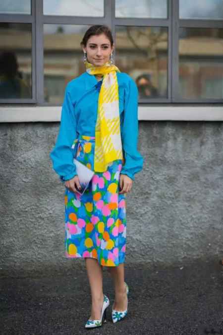 小七的意思呢,就是我们在花裙的色彩元素中选择一种色调来搭配。就像下面街拍中红色与蓝色的上衣其实都是呼应了花纹裙中的颜色元素,看起来时髦又和谐统一哦。