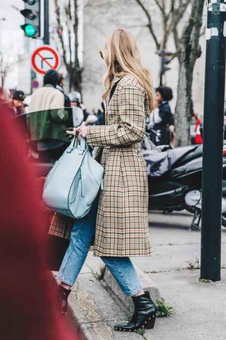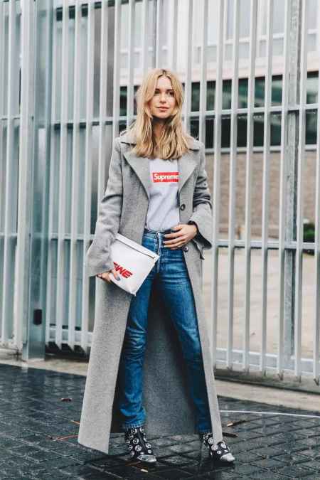 对于超长的灰色毛呢大衣,选择简单的牛仔裤最为合适,毫不拖沓,也不妨配上设计更加大胆的短靴,作为整个造型的亮眼之处。