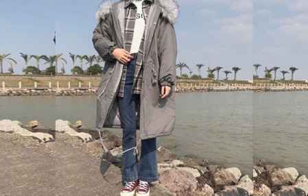 3、棉袄+高领T恤+格子衬衫+微喇牛仔裤+帆布鞋。深色系的搭配很衬托肤色,三层保暖。**一条微喇牛仔裤帆布鞋,在视觉上拉伸身体比例。嘘~别说话,今天全场你是最酷的小**!!