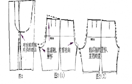 1、拆下前后裆及后腰如裆浅应加深,前裆裁直,小裆宽一般1寸—1.2寸,把前裤片以前挺缝为中对折看两边是否对称,如前小裆宽应裁去,后裆也一样把后片对折后大裆最多超侧缝0.3寸,多了应裁去,大裆宽不变向里移但必须保证后臀围尺寸够大,此时还应看看后腰翘是否高,如高应裁平。