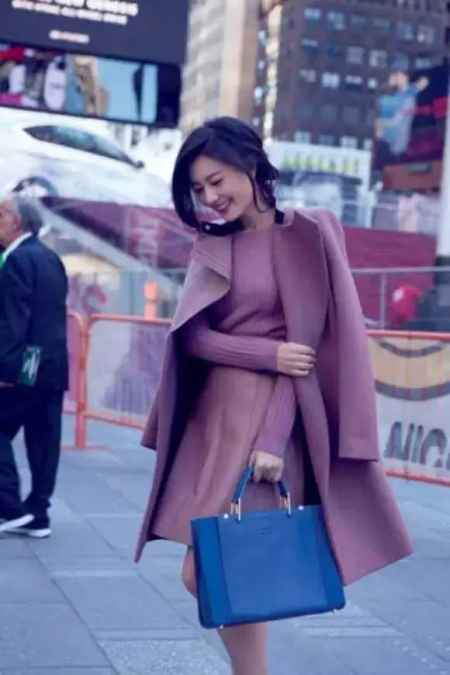 紫色毛呢大衣内搭同色系的毛衣和短裙,这种颜色沉稳大气,很适合追求质感的**们,轻松穿出迷人气质,让优雅感温暖升级,蓝色材质拼接手提包与之完美呼应。
