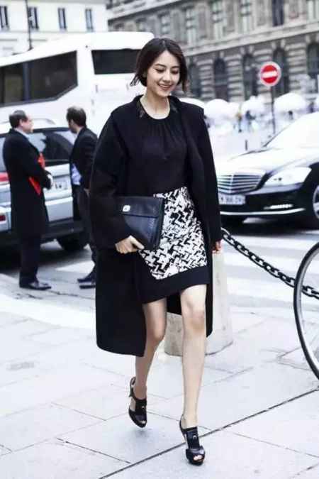 黑色廓形风衣外套搭配黑色连衣短裙,很适合小个子女生,但是一定不要搭配太长的风衣哦,刚过**就好!