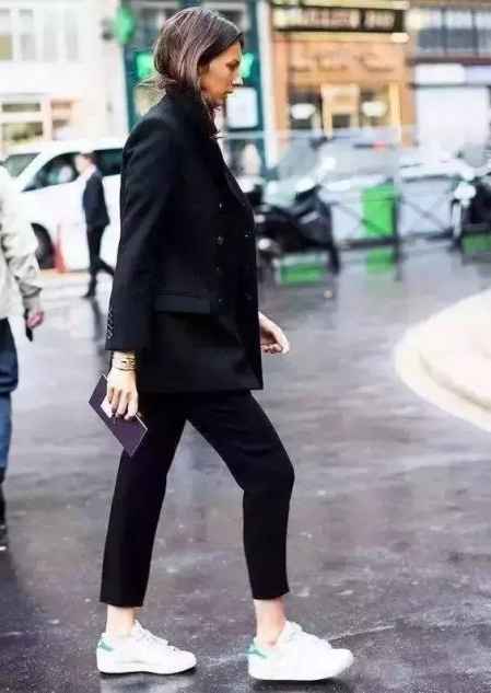 如果你实在不喜欢穿高跟鞋,运动鞋或平底鞋配西裤也同样好看。只不过是将高跟鞋的性 感干练改变为帅气干练,但是好看程度不相上下。