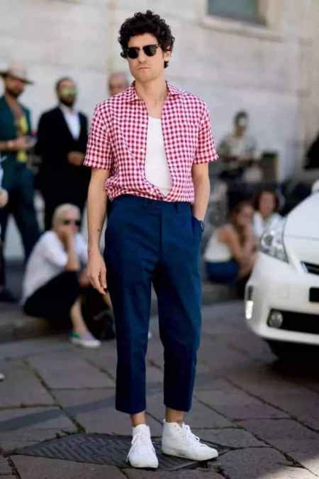 如果格子衬衫的颜色属于糖果色系,那么可以搭配条深蓝色卡其裤与白色板鞋,则更显青春活力,同时内搭万能小白T与小白鞋也可以相互呼应。