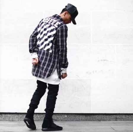 而臂部**闪电涂鸦款超大格纹衬衫,搭配卡其裤和黑色棒球帽,为整体的酷感增加精致成分。