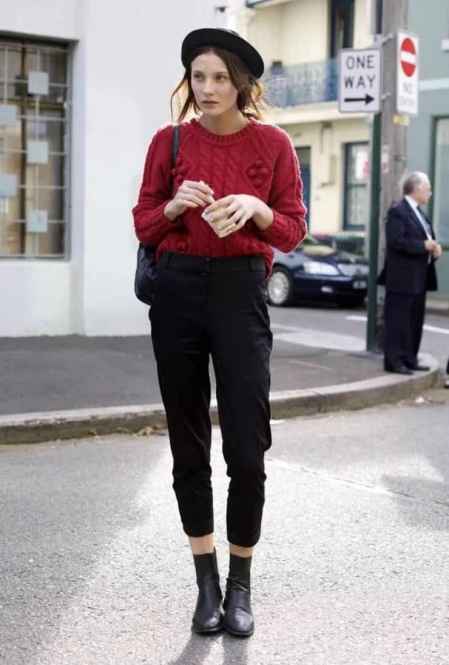 当红梨色运用在毛衣上,带来了视觉和身体的双重温暖,搭配一条黑色的裤子和小黑靴,不知不觉中彰显**品味。