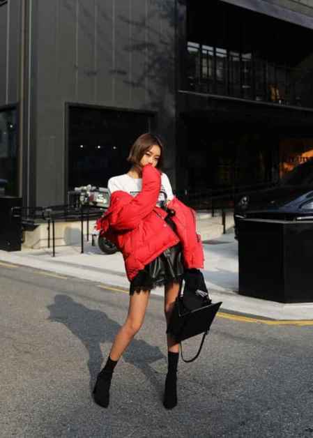 红色面包服搭配黑色的**是绝对不会出错的,黑色和红色是很经典的配色。红黑一冷一热搭配非常耀眼,,给人醒目刺激感。黑色显得神秘经典,红色看上去喜气奔放,两色相互中和融为一体,让喜悦活波又多了份沉稳。