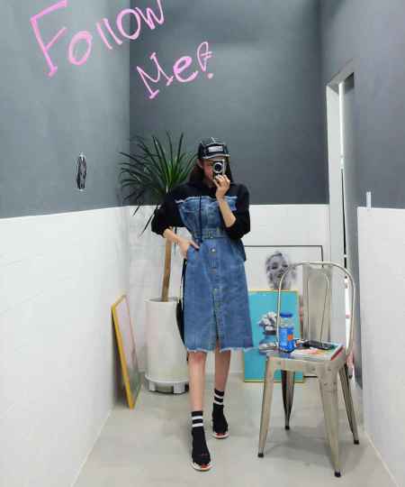 紧身款的牛仔连衣裙搭配一双黑色或者白色的运动鞋,突然感觉多了一丝女性的性感又不失俏皮感。很适合身材很棒又想显出来的小**们!
