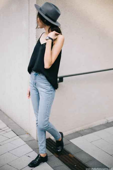 吊带雪纺上衣拼接小面积蕾丝更加性感精致,搭配浅蓝色牛仔裤和渔夫鞋,慵懒又随性。▼