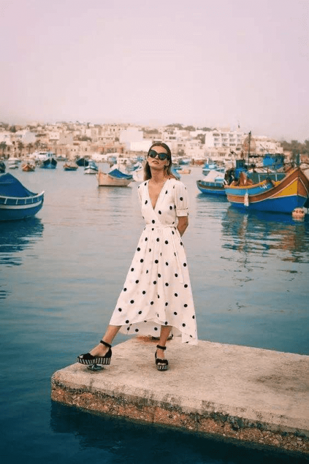 波点茶歇裙搭配高防水台凉鞋,穿上不仅洋气还特别衬肤色。