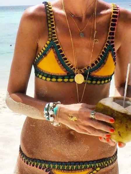 要问海边最适合什么泳装,毫无疑问就是比基尼了,对于身材足够自信的小仙女完全可以选择这种基础款的三点式泳装,在颜色的选择上也可以更加俏丽一些,哪怕是比较复杂的印花,因为泳装布料本身就不多,所以也不必担心会乱糟糟的。