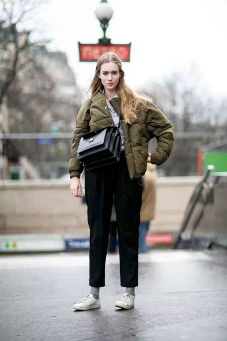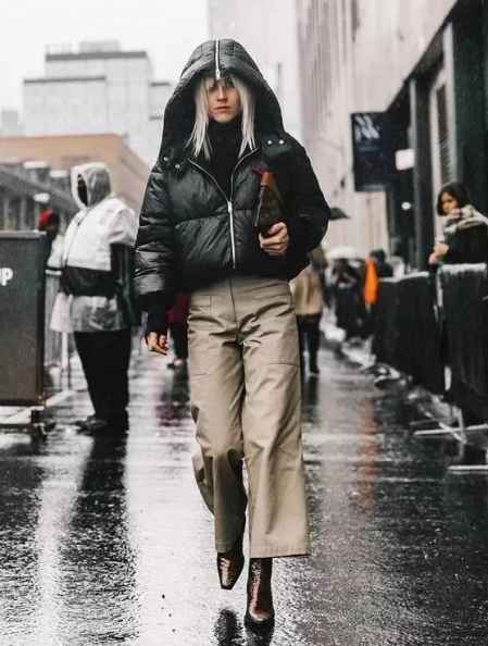阔腿裤配大衣有范儿,但是现在越来越多开始搭配羽绒服了。羽绒服是最适合冬天的外套,抗寒保暖比大衣强多了。对于羽绒服的选择,短款、运动款是首选。