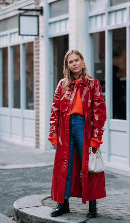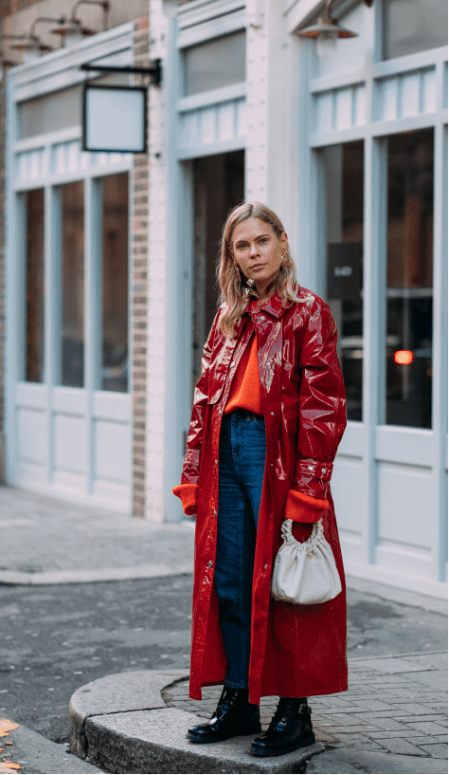 红色漆皮长款大衣+橘色针织毛衣+蓝色高腰牛仔裤+黑色短靴