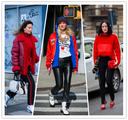 近几年流行的运动风让条纹运动裤大火了一把,黑红条纹运动裤搭配短靴摩登又时尚,搭配红色外套颜色上进行呼应,细节感十足。