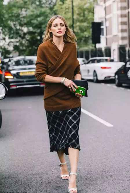 如果你比较喜欢低调有质感的打扮,像这种黑白色系的格纹裙其实更百搭,Olivia简单搭配一件大地**系的毛衣就很chic▼
