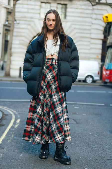 冬天很多人会穿色彩比较单一的羽绒服,不妨来一条长款格纹裙来打破沉闷▼