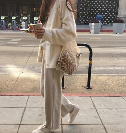 6、米色宽松毛衣+同色系阔腿裤