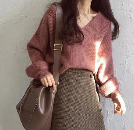 砖红色也是显肤色的好手,尤其是脸型有点小肉肉的女生,穿V领可以很巧妙的显脸小,露出美美的锁骨,有那么一丝丝的撩人感哦,配上咖色格纹半身裙,超温柔的感觉。
