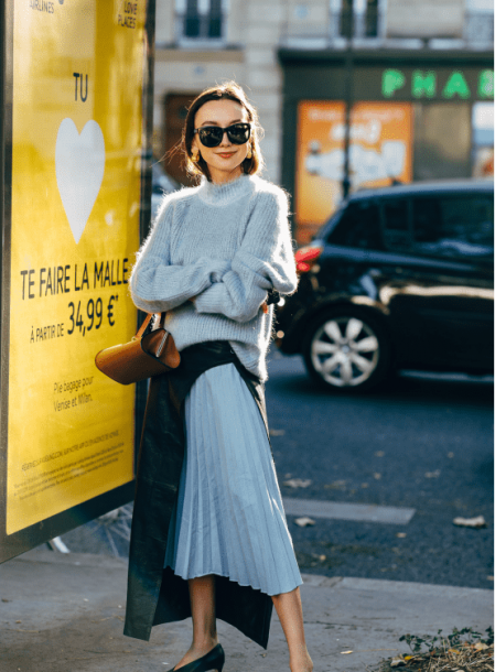 蓝色与蓝色的配搭犹如蓝宝石一般纯粹而出众,浅蓝色与同色系毛衣的配搭更显柔软与甜美。深蓝色的同色系搭配则会使得本身的优雅又多了一份简约大气感,深色与浅色的搭配则造就了渐变的美感。