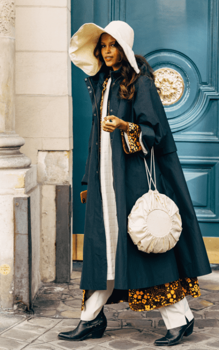 异域风情十足的叠穿混搭充满浓郁的民族气息,纹理繁杂的**系波西米亚风内搭薄外套与简约的蓝色大衣搭配,繁简色彩都得到了很好的和谐,将白色长裙作为上衣,整个造型飘逸十足,白色的西裤与黑色的皮鞋令整个造型充满混搭魅力又不失精致大气。