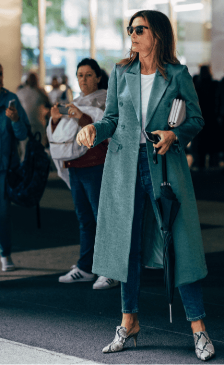 薄荷蓝大衣+白色短款上衣+蓝色小脚牛仔裤+蟒蛇纹尖头高跟鞋