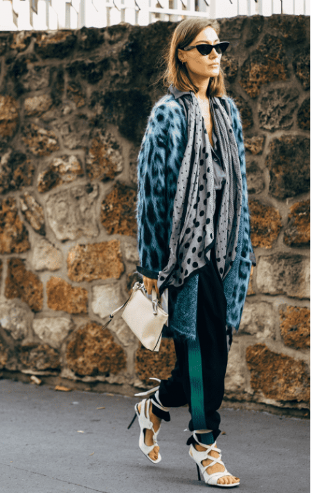 蓝色豹纹皮草质感大衣外套+灰色波点围巾+灰色上衣+黑色绿边阔腿裤+白色绑带凉鞋