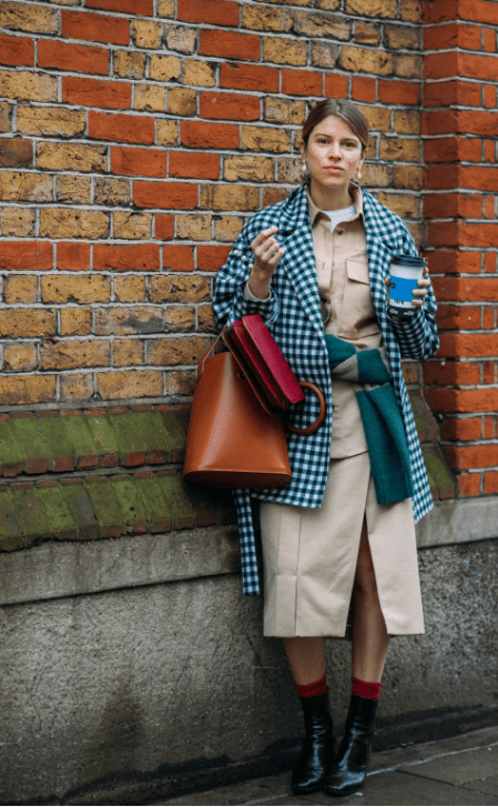 湖水蓝格纹大衣+浅卡其色工装上衣+浅卡其色开叉裙+绿色针织衫+红色短袜+黑色短筒靴