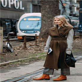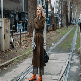 阔腿裤搭配长款马甲式的呢子大衣,保暖的同时又将身材勾勒得修长优雅,腰带系于腰上的位置更能凸显大长腿,搭配亮色皮靴能使整个造型不会过度暗沉。