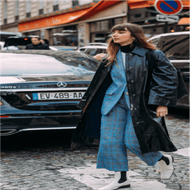 蓝灰相间的格纹搭配呢子面料的质感,顿显成熟稳重的气质,搭配黑色皮衣更添帅气,搭配黑白拼接筒靴独特而吸睛效果十足。