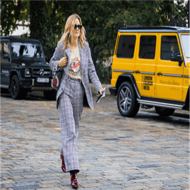 藕荷色与格纹的配搭复古不失柔美,笔挺的西装与阔腿裤充满**的优雅知性,搭配酒红色的皮靴,不仅让整个造型更有层次,且又多了几分性感。