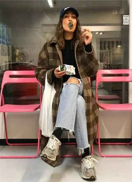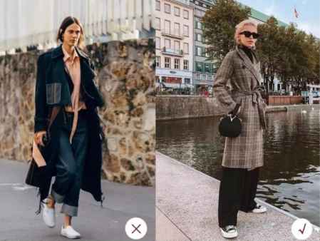 运动鞋一年四季都是百搭款,无论搭配怎样的服装,都能找到平衡支点。但是,越是百搭简约的款式,越多人出错。左图的长外套+牛仔裤,从整体上看是非常厚重。而鞋子却选了轻盈的白鞋,会显得头重脚轻。宁愿选择右图的长款阔腿裤,与整体统一。