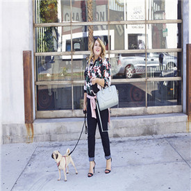 搭配点评:夸张的印花花纹,小心机的外套系腰,在将牛仔裤适当的卷边,整套搭配色彩和谐,也良好的拉长了人的比例。