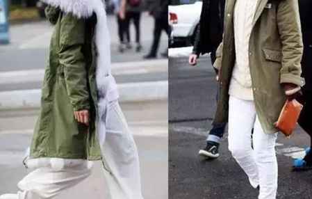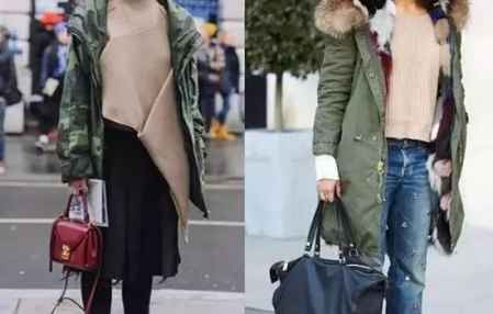 灰色是一个比较优雅,自信,又沉稳的颜色,搭配军绿色的派克服,像baby这种带白色大毛领的,就会显得非常清新减龄。