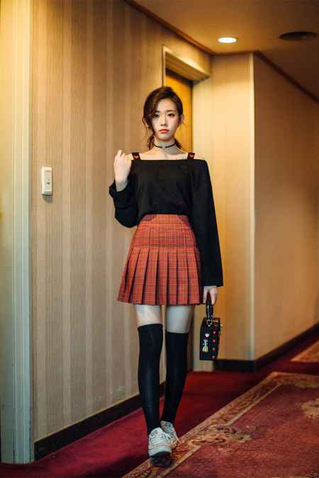 黑色长袖T恤和百褶裙这样的**单品混搭在一起,简直就是显瘦的障眼法,黑色遮肉,百褶裙又能为你藏住胯部。整身造型还多了几分俏皮感。