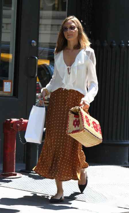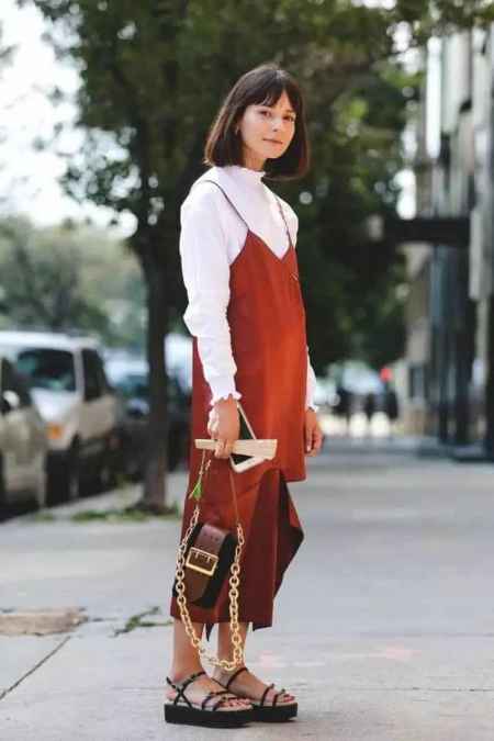 长款雪纺衬衫搭配红色吊带,充满这几感的手提包和凉鞋将视觉重点挪到了脚踝的部位。