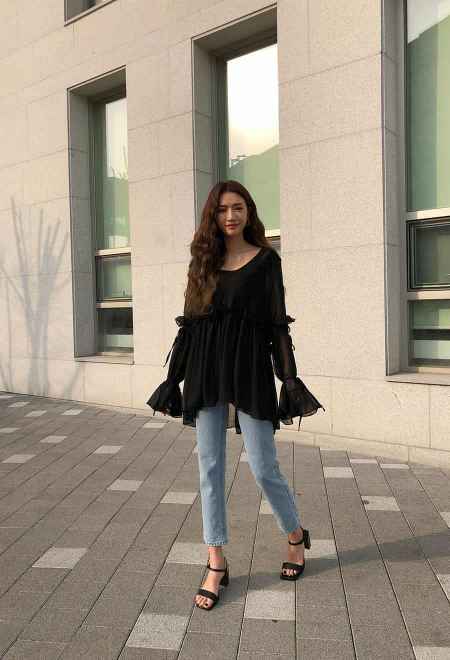 神秘的黑色雪纺衫搭配浅色牛仔裤和黑色细带的凉鞋,这个夏天也可以变成充满魔法的**小女巫。