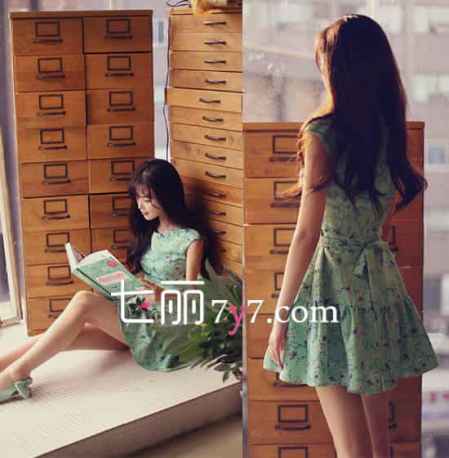 示范搭配:无袖蝴蝶结碎花裙+薄荷绿凉鞋