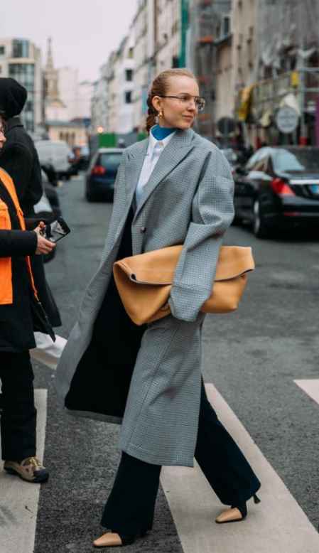 复古灰色格纹大衣搭配复古阔腿裤,双重复古让你穿越回时尚的90年代,复古爱好者一定不要错过。不过需要注意的是,尽量选择没有花纹或者是纯色的阔腿裤,这样搭配上灰色格纹大衣才不会让人觉得造型的繁复感。