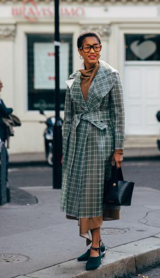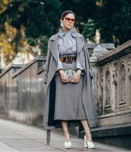 灰色格纹大衣搭配套装太适合想要悄悄偷懒的小仙女们了,基本上不需要怎么思考,穿上同色系的套装就对了。想要增加一些亮点的小仙女们也可以选择一些特别一点的腰带和手袋,如豹纹花色的腰带或者是斑马纹的手拿包,点亮整体look。