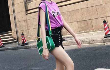 紫色虽然很挑人,但和黑白这样的基础色搭配起来还是不错的呢,黑色热裤的加入让短袖变得更加清爽和性感,搭配一双绿色包包,大胆撞色,出街更时髦!