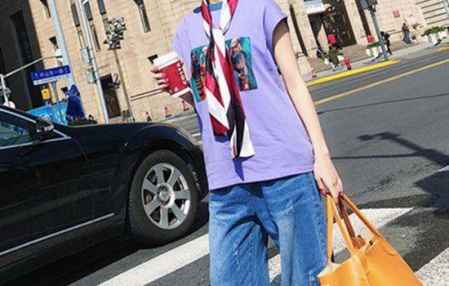 带有印花图案的紫色短袖,紫色加上一点**图案可以说今年的爆款了,甜美减龄又不会太老气,还有点萌萌哒的感觉,搭牛仔裤出街清爽洋气,感觉不管什么颜色,和牛仔裤搭配都是万能公式。
