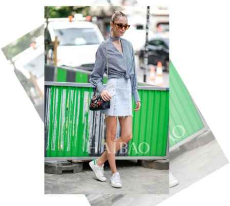 说起半身短裙,牛仔裙一定首当其冲!百搭不挑人的经典单品,时髦感只增不减~最安全的搭配就要属小白鞋这对CP了!